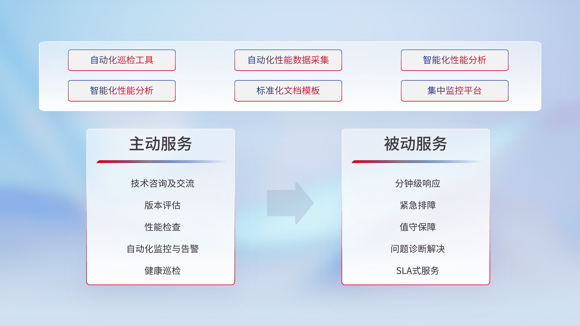 智能化工具和标准化文档,,保障服务质量,,提供主动服务(包含技术咨询、、、、版本评估、、性能检查、、自动化监控与告警、、、健康巡检)和被动服务包含(分钟级响应、、紧急排障、、值守保障、、问题诊断解决、、SLA服务)。。。